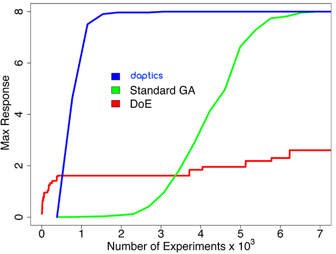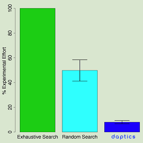 On this system, standard Design of Experiments (DoE) techniques were obviously more efficient than exhaustive exploration, but substantially less efficient than daptics.